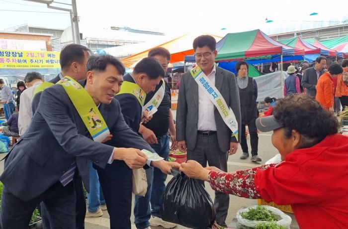 이날 김 서장은 심준보 청양시장상인회장, 경찰서 및 칠갑지구대 직원과 함께 ‘청양에서 장 보자!’라는 어깨띠를 하고 시장 일대를 다니며 지역 물품 구매를 당부했다.