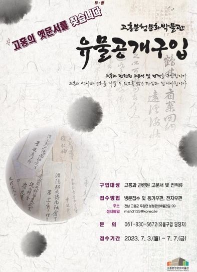 군 관계자는 “유물 구입을 통해 고흥의 역사와 문화유산을 보존·전승하고, 향후 이를 전시·연구·교육 등에 활용할 계획”이라며 “유물 소장자들의 적극적인 참여와 관심을 부탁드린다”고 밝혔다.