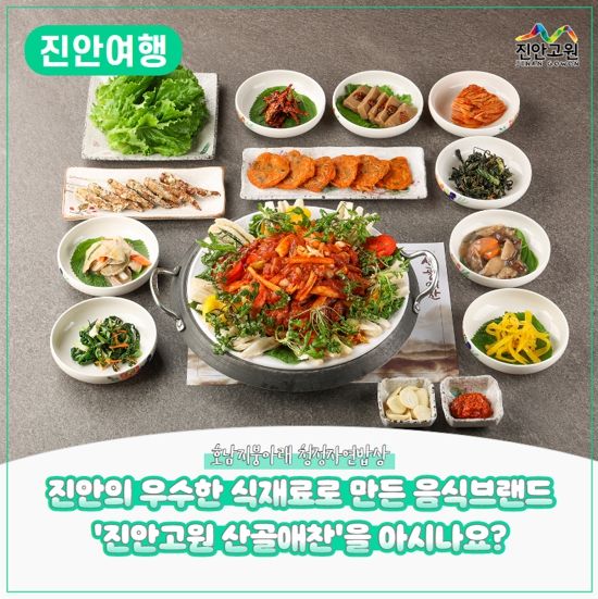 ‘진안고원 산골애찬’은 청정 진안고원에서 나는 우수한 식재료로 만든 음식 브랜드이다. 군 농업기술센터에서 2016년부터 현재까지 희망 업체를 대상으로 농가 맛집 창업, 전문가 메뉴 컨설팅 등을 지원해 진안만의 특색있는 맛집들로 육성한 15개소 음식업소가 그 대상이다.