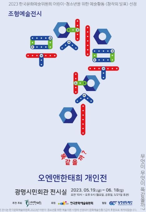 [제주교통복지신문 김강석 기자] 광명문화재단은 한국문화예술위원회 2023 어린이청소년을 위한 예술활동 “창작의 발표” 선정 된 조형예술전시 “무엇이 무엇이 똑같을까?”가 오는 19일부터 6월 18일(월요일, 공휴일, 5월 21일(일))까지 광명시민회관 전시실에서 열린다.