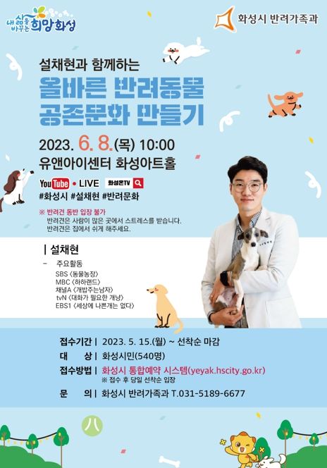 [제주교통복지신문 김강석 기자] 화성시가 오는 6월 8일 설채현 수의사와 함께하는 ‘올바른 반려동물 공존문화 만들기’특강을 개최한다.