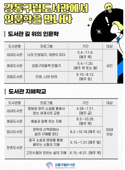 '도서관 길 위의 인문학'사업은 지역 주민이 함께 참여하는 인문학 강연·탐방프로그램으로 ▲성내도서관 ‘나의 인생일지, 대본이 되다’ ▲해공도서관 ‘강동구 마을 책 만들기’ ▲강일도서관 ‘안녕, 나의 반려’를 주제로 생활 속 쉬운 인문학을 구현한다.