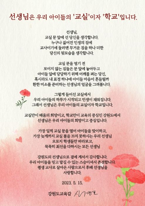 또한 “가장 일찍 교실 문을 열어 아이들을 맞이하고, 가장 늦게까지 교실 불을 끄지 못하시는 우리 선생님. 오로지 학생들만 바라보고 묵묵히 최선을 다하시는 모든 선생님”께 “강원도의 선생님으로 곁에 계셔서 감사합니다. 우리 아이들을 믿고 맡길 수 있는 스승이셔서 존경합니다. 평생 교사로 살아온 사람으로서 후배 선생님을 사랑합니다.”라는 말로 선생님에 대한 존경과 감사의 마음을 전했다.