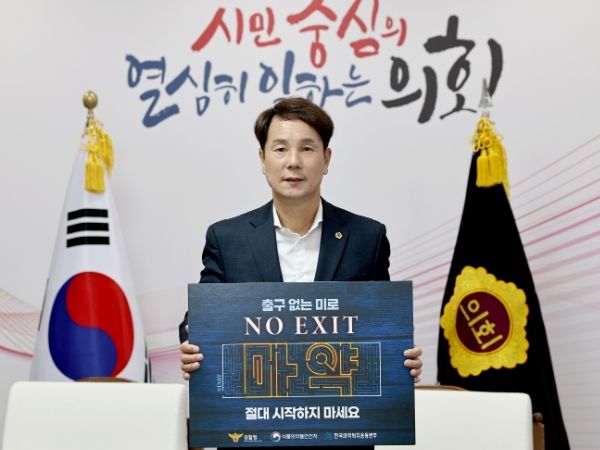 [제주교통복지신문 김강석 기자] 대전시의회 이상래 의장은 15일(월) 마약범죄 예방을 위한 ‘NO EXIT(출구없음)’릴레이 캠페인에 동참하기 위해 캠페인 이미지를 촬영하고 언론에 배포하는 등 마약퇴치 홍보활동을 진행했다.