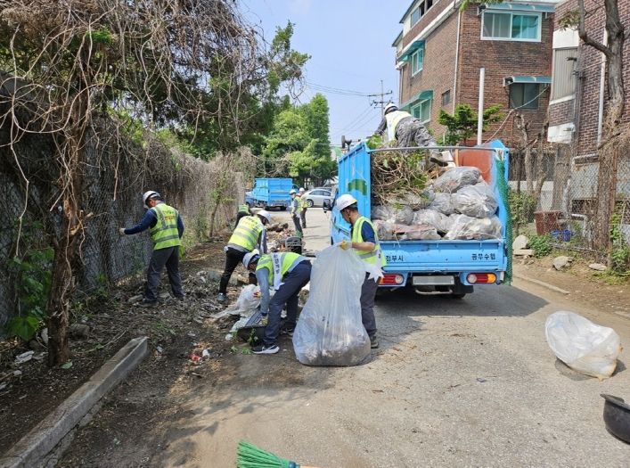 이날은 ㈜의정환경개발 직원 12명과 의정부2동 직원 4명이 협력해 벌말어린이공원 앞 미군기지 진입로의 장기간 방치된 쓰레기 폐기물 3톤가량을 차량 3대를 동원해 깔끔하게 정비했다.