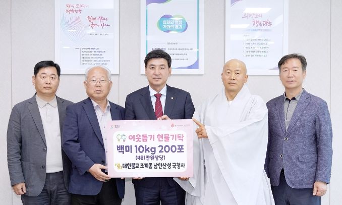 광주시에 따르면 12일 남한산성 대한불교 조계종 국청사·장경사에서 각각 백미10kg 200포(481만원 상당)·백미20kg 100포(481만원 상당)를, 탄벌동 한림정사에서 성금 500만원을 기탁했다.
