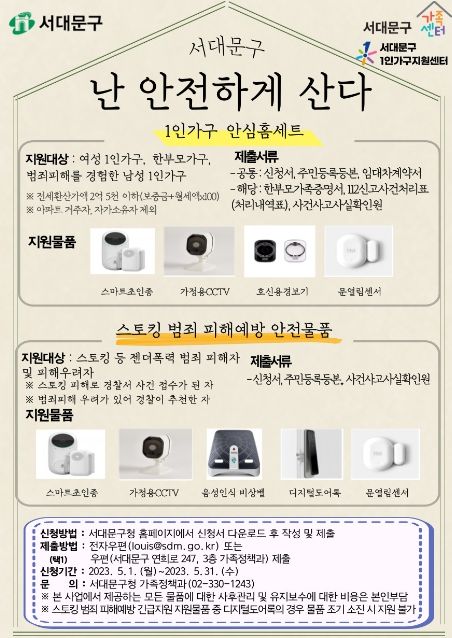 분야는 ‘1인가구 안심홈세트 지원’과 ‘스토킹 범죄 피해예방 안전물품 지원’이며 서대문구가족센터와 함께 추진한다.