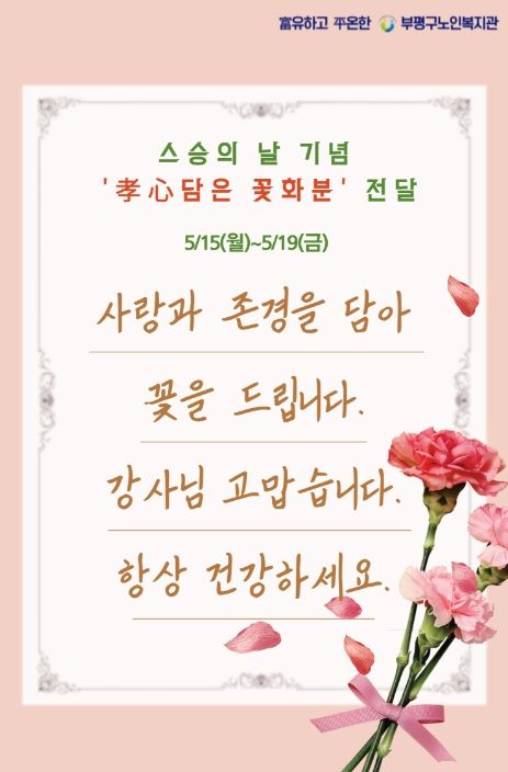 [제주교통복지신문 김강석 기자] 인천시 부평구노인복지관은 제42회 스승의 날을 맞이하여 복지관 평생학습 강사 및 경로당 여가문화 보급사업 강사 54명을 대상으로 오늘 15일부터 19일까지 5일간 다육이 꽃 화분을 증정한다고 밝혔다.