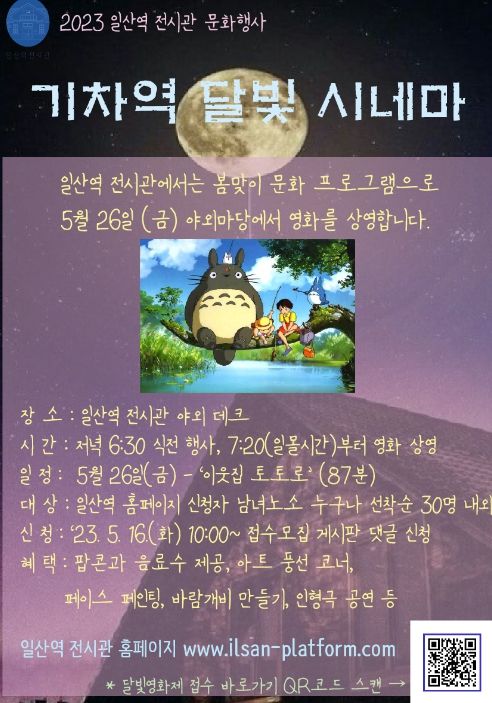 [제주교통복지신문 김강석 기자] 고양특례시와 (사)고양시새마을회에서 위탁 운영하고 있는 고양 일산역 전시관에서는 오는 5월 26일 전시관 야외마당에서 ‘기차역 달빛 시네마’를 운영한다.