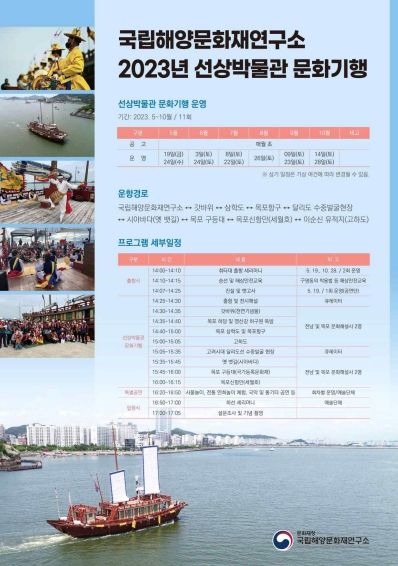 [제주교통복지신문 김강석 기자] 문화재청 국립해양문화재연구소(소장 김성배)는 5월부터 10월까지 총 11회에 걸쳐 목포 바다 위에서 펼쳐지는 ‘선상박물관 문화기행’을 운영하기로 하고, 오는 19일 국민과 함께 이번 행사의 시작을 알리는 출항식을 개최한다.