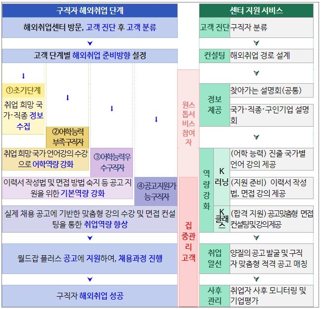 먼저 해외취업 희망 청년은 서울·부산 해외취업센터에서 운영하는 온·오프라인 컨설팅을 통해 구직자 역량진단을 받을 수 있다.