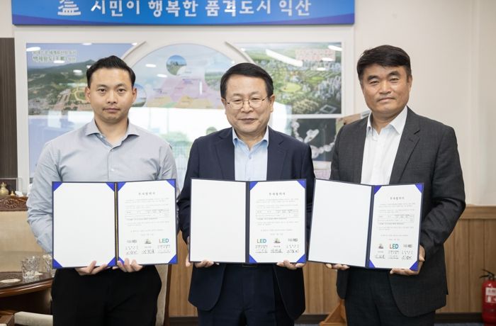 이날 협약식에는 15일 정헌율 익산시장과 익산LED협동화단지개발(주)김진곤 대표, ㈜뒤에있다 이장미 대표 등이 참석했다.