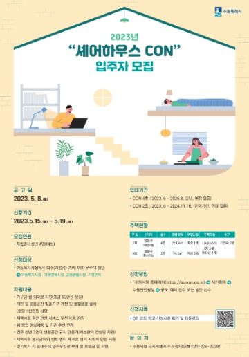 셰어하우스 CON 2호(영통구 매탄4동)에 입주할 청년 1명, 4호(팔달구 화서1동)에 입주할 청년 3명을 모집한다. 2호는 2024년 11월 18일까지, 4호는 2025년 6월까지 거주할 수 있다(연장 없음). 2호에는 현재 청년 2명이 거주하고 있다.