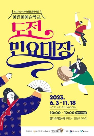[제주교통복지신문 김강석 기자] 오는 6월 3일부터 11월 18일까지 경기소리전수관에서 (사)한국경기소리보존회가 주최, 주관하고 문화재청, 과천시가 후원하는 2023 전수교육관 활성화사업 어린이예술학교 ‘도전! 민요대장’을 운영한다.