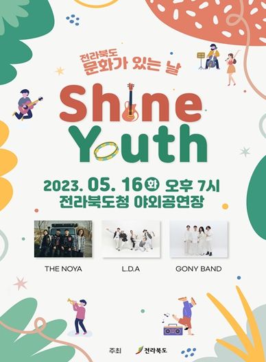 [제주교통복지신문 김강석 기자] 전라북도가 신록의 계절 5월을 맞아 '전북 청년예술인과 함께하는 ‘Shine Youth’(빛나는 청춘)' 라는 주제로 ‘문화가 있는 날’ 행사를 16일 (19시) 개최한다.