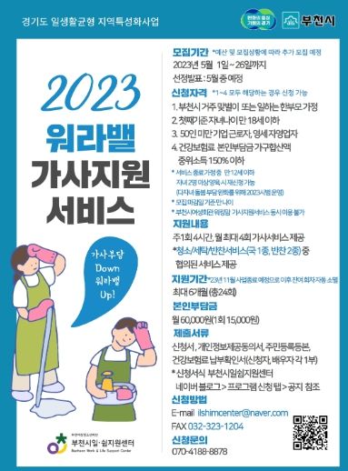 [제주교통복지신문 김강석 기자] 부천시 일·쉼지원센터(운영법인:부천시여성청소년재단)는 경기도 일생활균형 지역특성화 사업의 일환으로 ‘워라밸 가사지원서비스’를 운영하고 있다.