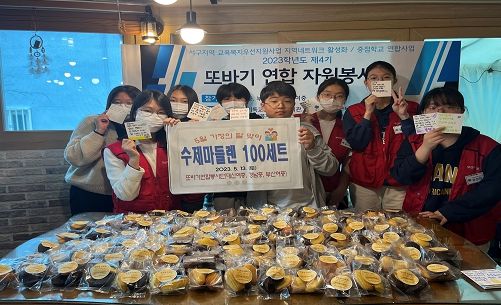 [제주교통복지신문 김강석 기자] 부산 중학생 연합봉사단인 '또바기연합자원봉사단(대신여중, 경남중, 부산여중)'은 지난 13일, 가정의달 5월을 맞아 학생들이 손수 만든 마들렌 100세트를 동대신2동에 기부했다. 기부된 마들렌은 관내 취약계층에게 전달되어 따뜻한 이웃사랑의 온기를 전할 예정이다.