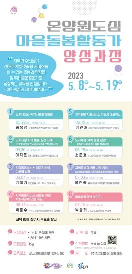 [제주교통복지신문 김강석 기자] 온양원도심 도시재생현장지원센터에서 5월 22일부터 7월 10일까지 총 8회에 걸쳐 온양원도심 마을돌봄활동가 양성과정을 운영한다.
