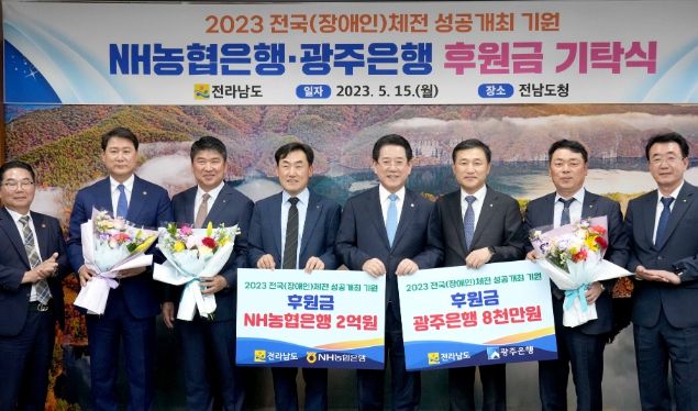 [제주교통복지신문 김강석 기자] 전라남도는 15일 도청 귀빈실에서 2023 전국체전 성공 개최를 위해 지역 금융의 든든한 버팀목인 농협·광주은행이 후원금을 기탁식을 했다고 밝혔다.