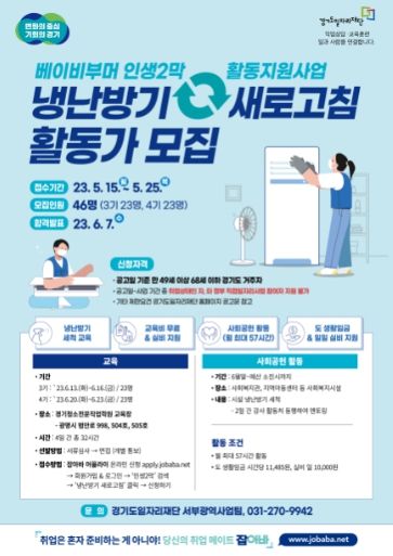 [제주교통복지신문 김강석 기자] 경기도 베이비부머기회과와 경기도일자리재단이 ‘2023년 베이비부머 인생2막 활동지원 사업 - 냉난방기 새로고침 3기~4기 활동’에 참여할 활동가를 모집한다.
