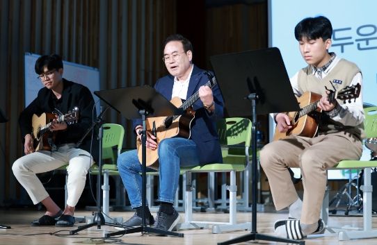서 교육감은 학생과 교직원에 대한 사랑과 감사의 마음을 노래에 담아 전달했다. 직접 기타를 치며 해바라기의 ‘사랑으로’를 부른 것. 또 신흥중 학생들이 뽑은 ‘존경의 대상’을 수상했다.