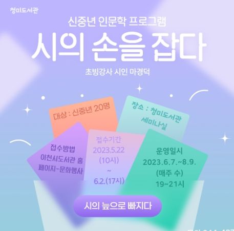 [제주교통복지신문 김강석 기자] 이천시 청미도서관에서는 6월 7일부터 8월 9일까지 (신)중년 인문학프로그램'시의 손을 잡다'을 운영한고 밝혔다.