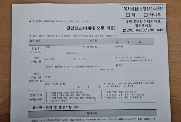 중구는 전입신고서 윗부분에 ‘복지 상담이 필요하세요?’라는 문구와 ‘예/아니오’답변 항목을 삽입해, 전입 가구가 건강 또는 경제적 어려움을 겪고 있는지 등을 확인할 예정이다.