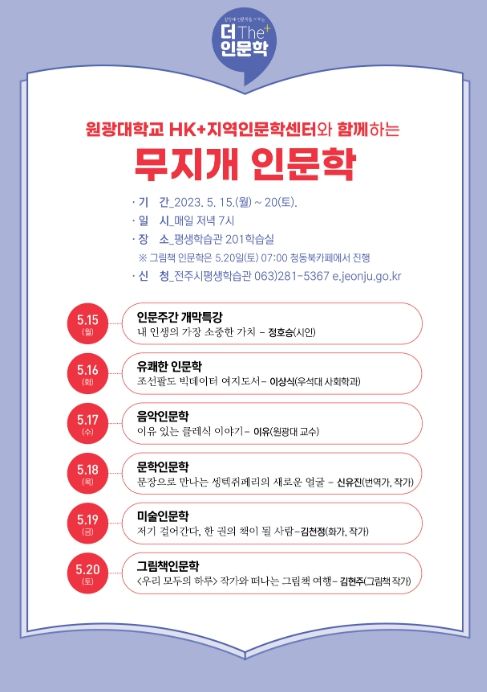 [제주교통복지신문 김강석 기자] 전주시가 미술·음악 등 다양한 분야의 인문학을 만나볼 수 있는 인문주간을 운영한다.