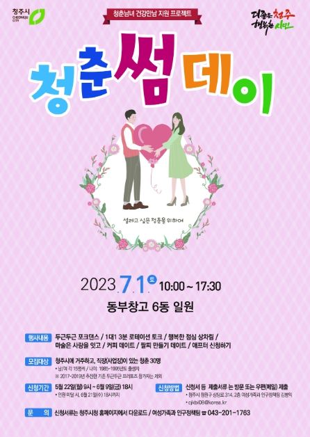 [제주교통복지신문 김강석 기자] 청주시는 미혼남녀를 대상으로 다가오는 7월 1일, 청춘남녀 건강만남 지원 프로젝트 ‘청춘 썸데이’를 개최한다고 밝혔다.