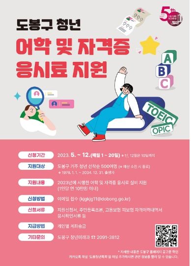 [제주교통복지신문 김강석 기자] 도봉구가 올해 5월부터 미취업 청년들의 취업 경쟁력 향상과 경제적 부담 완화를 위해 어학 및 국가자격시험 응시료 지원사업을 추진한다고 밝혔다.