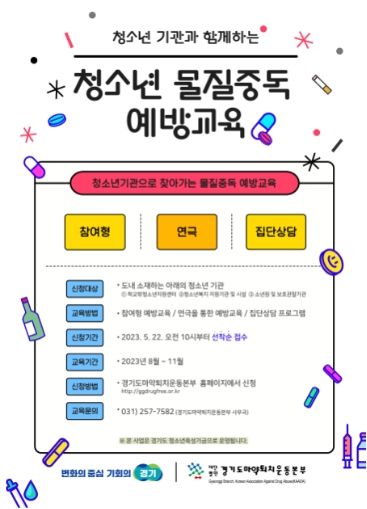 지난 2월 도는 청소년 물질중독 예방사업을 추진할 단체를 공개 모집하고, 약물중독문제의 전문기관인 경기도마약퇴치운동본부를 사업 운영 단체로 선정했다.