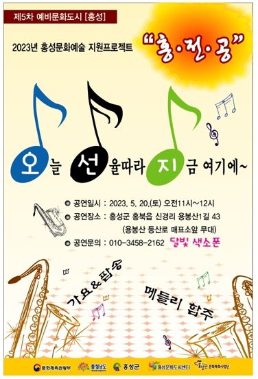 [제주교통복지신문 김강석 기자] 홍성문화도시센터·홍성군문화특화사업단의 2023년 홍성 문화·예술 지원 프로젝트 홍·전·공 사업에 선정된 달빛색소폰의 ‘오늘 선율따라 지금 여기에~’공연이 5월 20일 오전 11시부터 용봉산 등산로 매표소 앞 무대에서 개최된다.
