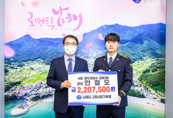[제주교통복지신문 김강석 기자] 남해군은 남해읍 출신 안철오 경위가 첫 월급 전액(220만 7500원)을 고향사랑기부금으로 전달해 왔다고 16일 밝혔다.