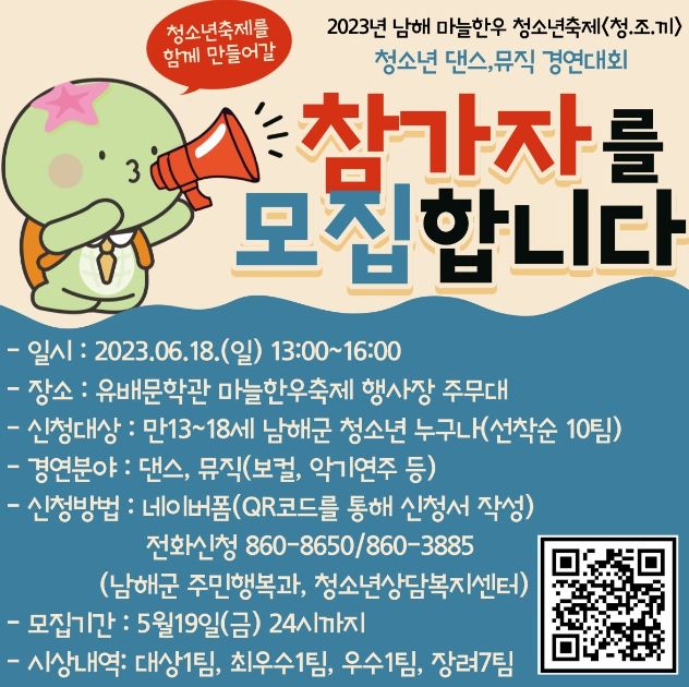 주민행복과 류기찬 과장은 “청소년들에게 끼와 재능을 발산할 수 있는 기회를 제공하고, 청소년과 다양한 세대가 어우러지는 어울림 한마당이 되길 바란다.” 고 밝혔다.