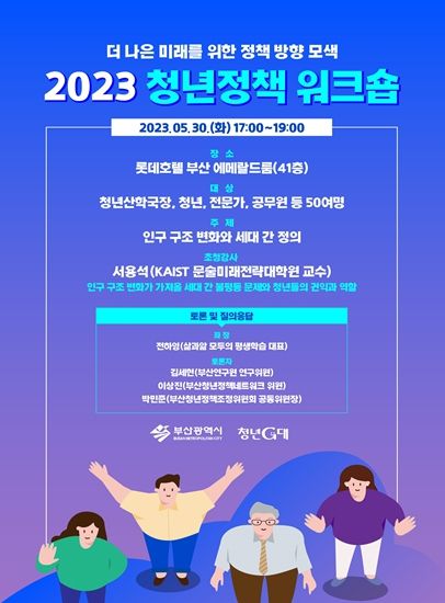 [제주교통복지신문 김강석 기자] 부산시는 청년의 정책 참여를 확대하고 청년의 목소리를 정책에 적극적으로 반영하기 위해 오는 5월 30일 오후 5시 롯데호텔 부산 에메랄드룸에서 '2023 청년정책 워크숍'을 개최한다고 밝혔다.