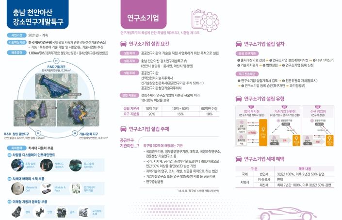 천안·아산 강소특구는 국내 유일의 자동차 관련 전문생산기술연구소인 한국자동차연구원(기술핵심기관/0.24㎢)을 중심으로 천안아산 연구개발(R·D) 집적지구(천안 불당·아산 탕정)와 천안풍세지구(풍세일반산업단지)를 배후공간(1.08㎢)으로 지정해 2021년도부터 사업을 수행하고 있다.