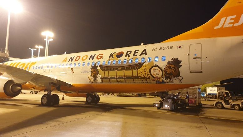 [제주교통복지신문 김강석 기자] 관광거점도시 안동 홍보를 위해 안동의 탈과 누각이 래핑된 보잉 737 항공기가 하늘을 난다.