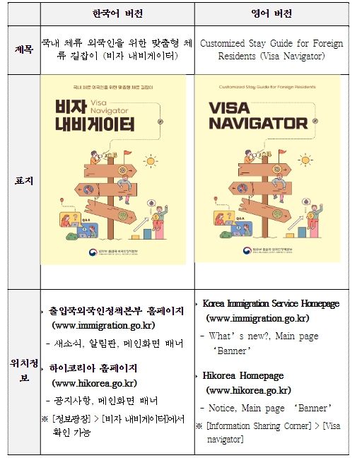 ‘비자 내비게이터’는 한국어가 서툰 외국인의 민원 편의를 위해 영어로 작성된 안내서가 필요하다는 의견을 적극 반영하여 제작됐으며, 출입국․외국인정책본부 홈페이지와 하이코리아 홈페이지에서 확인할 수 있다.