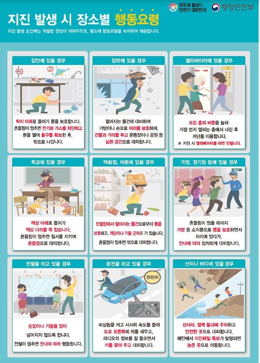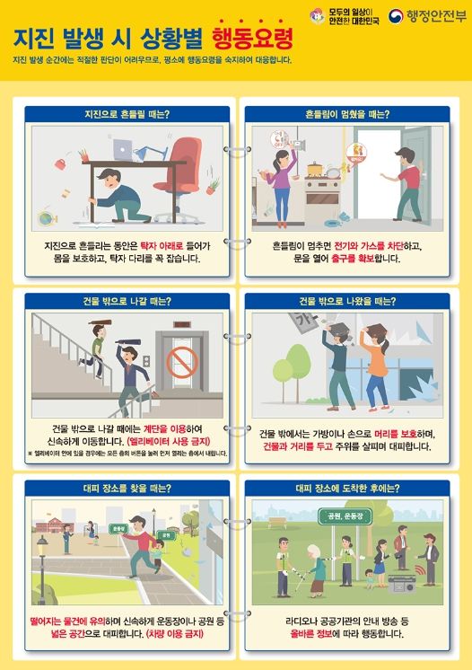 지진 발생 순간에는 적절한 판단이 어려우므로, 평소에 행동요령을 숙지하여 대응합니다.