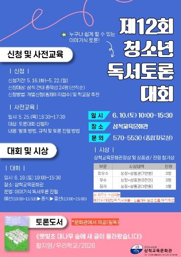 [제주교통복지신문 김강석 기자] 삼척교육문화관은 6월 10일 삼척 관내 중학생을 대상으로'제12회 청소년 독서토론대회'를 개최한다.