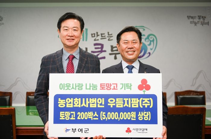박정현 부여군수는 “부여군 어려운 이웃들을 위해 나눔을 몸소 실천해 주시는 우듬지팜 강성민 대표님께 존경을 표하며 우듬지팜의 나눔과 사랑이 부여군 어려운 이웃들에게 많은 도움이 될 것”이라고 고마움을 전했다.