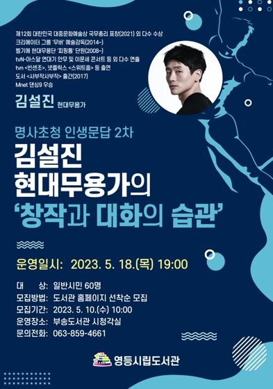 [제주교통복지신문 김강석 기자] 익산시 영등시립도서관은 18일 저녁 7시 김설진 현대무용가를 초청해 ‘창작과 대화의 습관’을 주제로 ‘인생문답’강연을 진행한다.