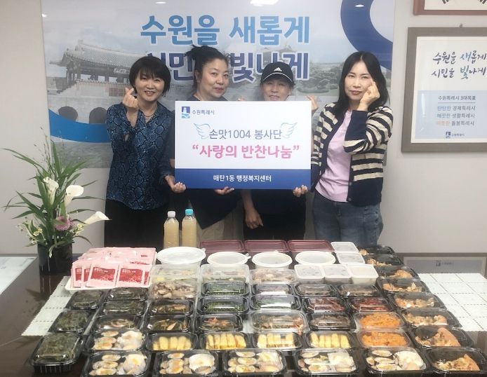 손맛1004봉사단은 매탄1동과 인근지역 주민 등 다양한 회원들 15여명으로 구성된 민간 봉사단체로 어려운 이웃을 생각하며 매월 1회 직접 조리한 반찬을 통해 나눔을 실천해 오고 있다.