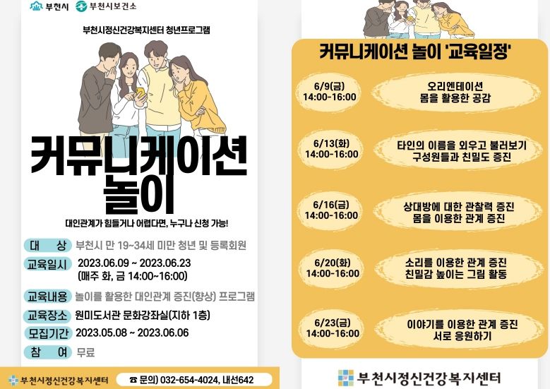 [제주교통복지신문 김강석 기자] 부천시와 부천시정신건강복지센터는 오는 6월 9일부터 6월 23일까지 청년들의 대인관계 능력 향상을 위해 ‘커뮤니케이션 놀이’프로그램을 운영한다.