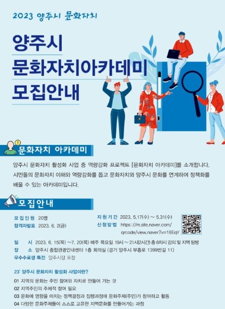 [제주교통복지신문 김강석 기자] 양주시가 오는 17일부터 관내 시민을 대상으로 ‘문화자치 아카데미’수강생을 20명을 모집한다.