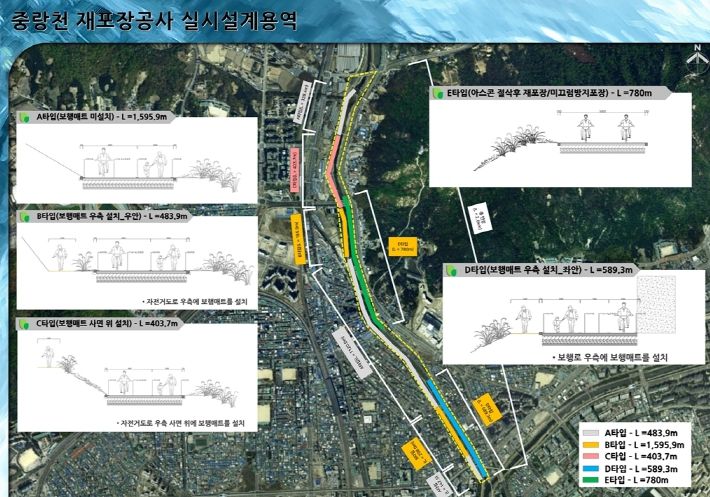 우선, 중랑천 우안 산책로를 하천 쪽으로 배치해 하천을 조망하면서 걸을 수 있도록 개선한다. 산책로 단절 구간은 연결하고, 좁은 구간은 확장해 산책로의 질을 높여나갈 계획이다.