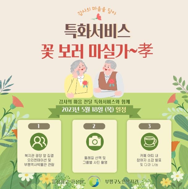 [제주교통복지신문 김강석 기자] 인천시 부평구노인복지관은 5월 가정의 달을 맞이하여 노인 맞춤 돌봄 특화서비스 참여자 16명을 대상으로 굴포천 둘레길 나들이 프로그램인 ‘꽃 보러 마실가孝’ 행사를 진행한다고 밝혔다.