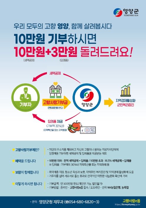 영양군 출신 회원으로 이루어진 농협 영농회 회원들은 제18회 영양 산나물 축제장 내에 설치된 고향사랑기부제 홍보부스에 방문하여 현장에서 기부하고 우리 농산물로 답례품을 교환했으며, 고향사랑기부제에 대한 응원과 더불어 우리 농산물의 소비 촉진에 대한 당부의 말도 잊지 않았다.