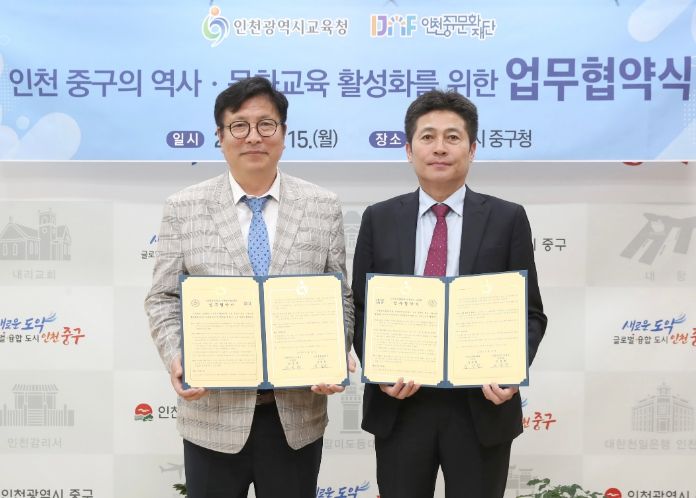 [제주교통복지신문 김강석 기자] (재)인천중구문화재단은 15일 중구청 구청장실에서 인천광역시교육청과 ‘인천 중구 역사·문화 교육 활성화를 위한 업무협약(MOU)’을 체결했다.
