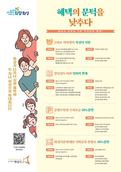 정구선 시민복지국장은 “이번 다자녀 기준 확대로 다자녀가정의 자녀 양육 부담이 조금이나마 감소되길 바란다”며 저출생 문제를 개선 할 수 있도록 실효성 있는 출산·양육 정책을 추진하여 아이 키우기 좋은 화성시를 만들어 나가겠다”고 밝혔다.